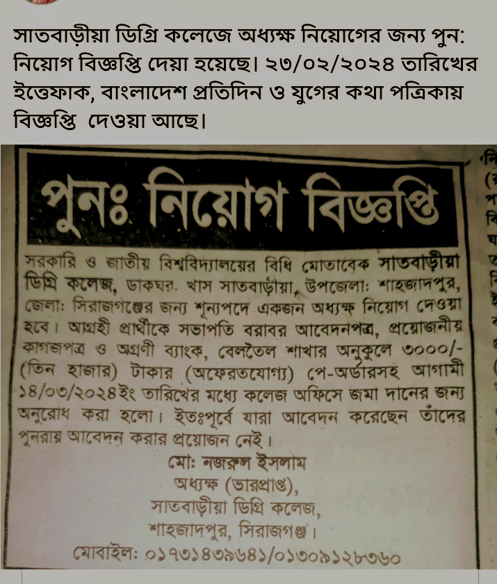 অধ্যক্ষ নিয়োগের পুনঃ বিজ্ঞপ্তি