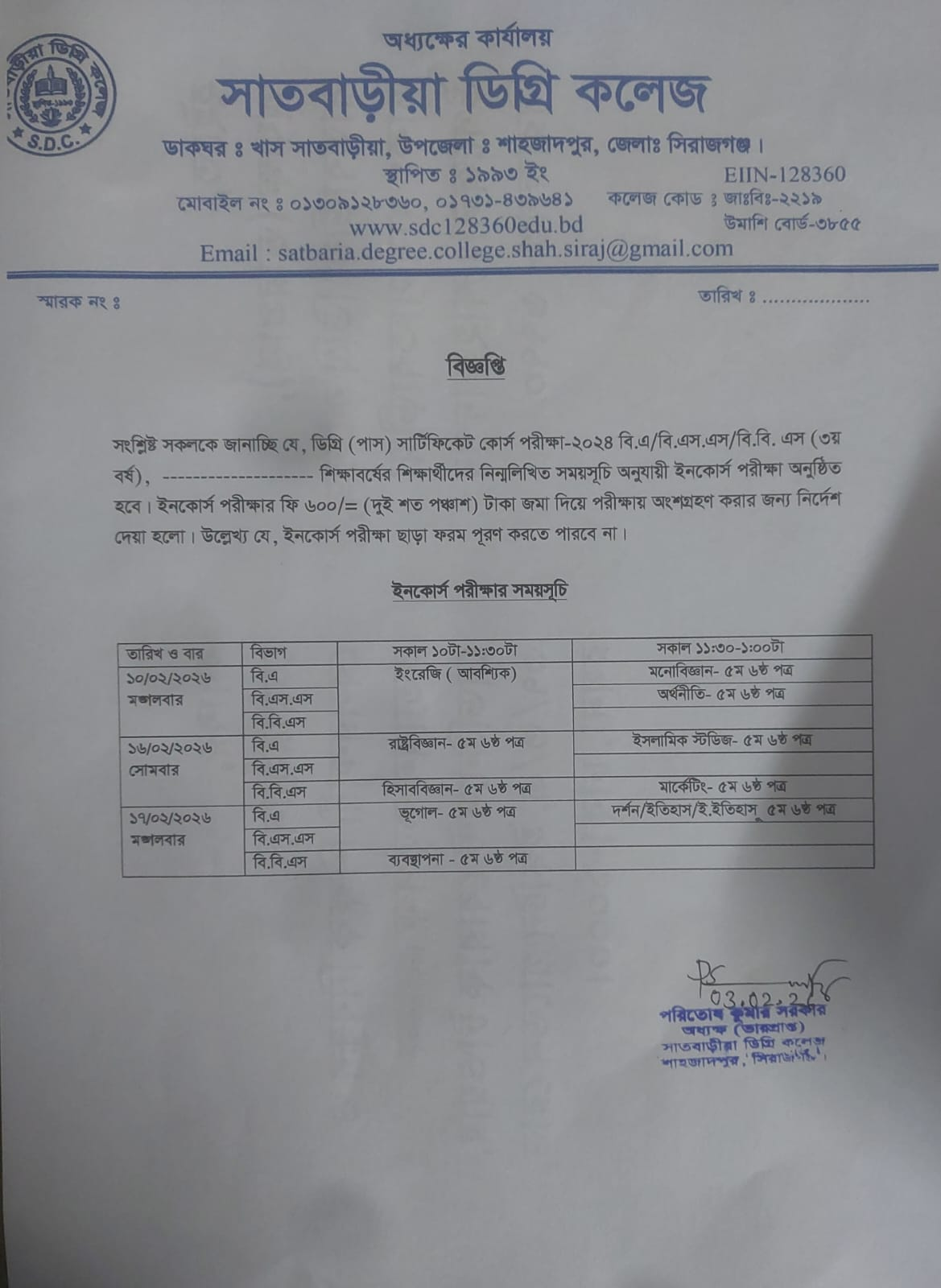 ইনকোর্স পরীক্ষার সময়সূচি।